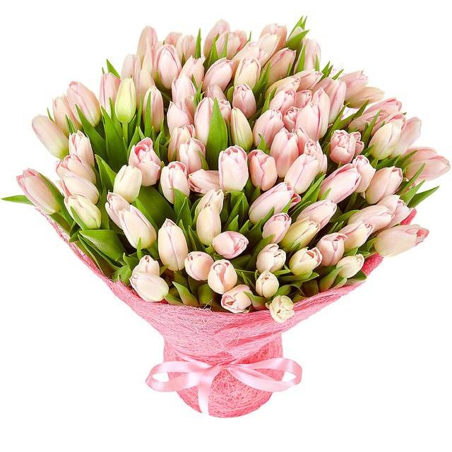 Тюльпан – это невероятно нежный и изящный цветок, с помощью которого можно создать композицию поражающей красоты без использования дополнительного декора, а бледно-розовый оттенок цветка, символизирующий грацию, молодость и нежность, сделает букет еще более трепетным и воздушным. Перед букетом из 101 розового тюльпана не устоит ни одна женщина, так как эта выразительная композиция демонстрирует неподдельный интерес и влюбленность, а именно их и ждут представительницы прекрасного пола.