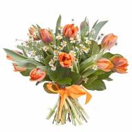 Стильный и невероятно красивый букет в основном состоит из оранжевых тюльпанов, с их помощью поднимается настроение и желается крепкое здоровье любому человеку, именно это символизирует оттенок цветка. Композиция выглядит еще интересней и гармоничней за счёт скромной красоты ромашек и множества зелени, придающей букету свежести и яркости. Таким подарком можно обрадовать любимую женщину, членов семьи, друзей или же преподнести в качестве извинения.