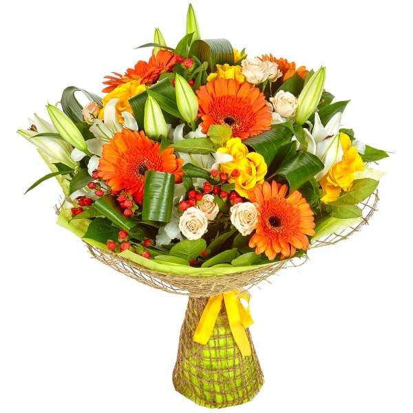 Основу солнечной композиции составляют оранжевые герберы. Они помогут подчеркнуть вашу привязанность и уважение. Элегантные кустовые и одноголовые розы выразят искреннюю любовь, а утонченные лилии символизируют невинность и чистоту. При выборе подарка коллеге, обратите свое внимание на яркую композицию. Букет подарит море позитивных эмоций получателю.